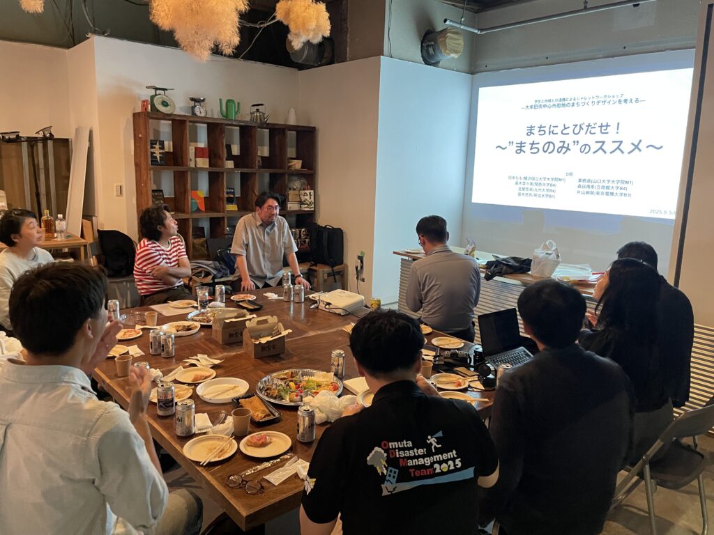 今回は「学生ワークショップから広がるミライ」をテーマとし、9/3-7に開催された日本建築学会主催の学生シャレットワークショップにおいて提案された学生のまちづくりアイデアを、パネルや提案資料を見ながら、世代や立場を超えて大牟田のまちづくりについてそれぞれの想いを語り合いました。