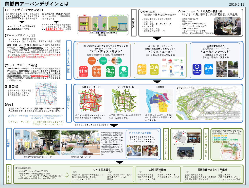 この状況を変えるべく、前橋出身でJINSホールディングスCEOの田中仁氏が中心となり、2016年に前橋市民が一体となって「めぶく。」ビジョンを策定。官民で米国ポートランド視察も行い、地域のキーパーソンがワークショップを重ねて「前橋アーバンデザイン」が誕生しました。実行部隊として「前橋デザインコミッション(以下、MDC)」を設立し、実際のモデルプロジェクトとして馬場川通りの水路と公共空間の民間主導再整備など、市民がまちの変化を体感できる取り組みを進めています。