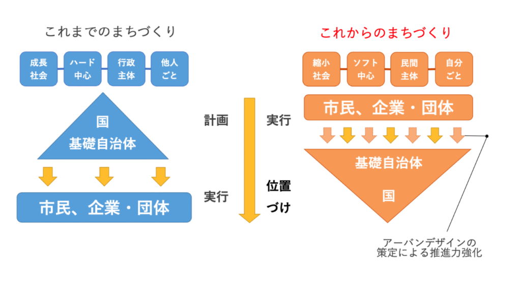 アーバンデザインづくりの出発点は、「尖ったもの」を目指す姿勢にありました。前橋では、熱意と実行力を持つ約200名のキーパーソンが集まり、11回にわたるワークショップを通じて「どの地域にも当てはまる一般論ではない、前橋らしい都市構造」を描き出していきました。市民、商店主、企業、そして外部の専門人材が一体となり、まちの骨格づくりに取り組んだ点が印象的でした。