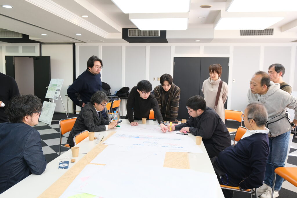 続いて、国道を挟んだ東側・西側のエリアについても、今後のまちづくりの進め方を検討しました。それぞれのエリアにどのような都市機能を求めるべきか、またそれをどのようなプロセスで実現していくべきか。官民学の垣根を越えた活発な意見交換が行われました。