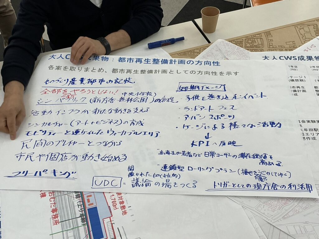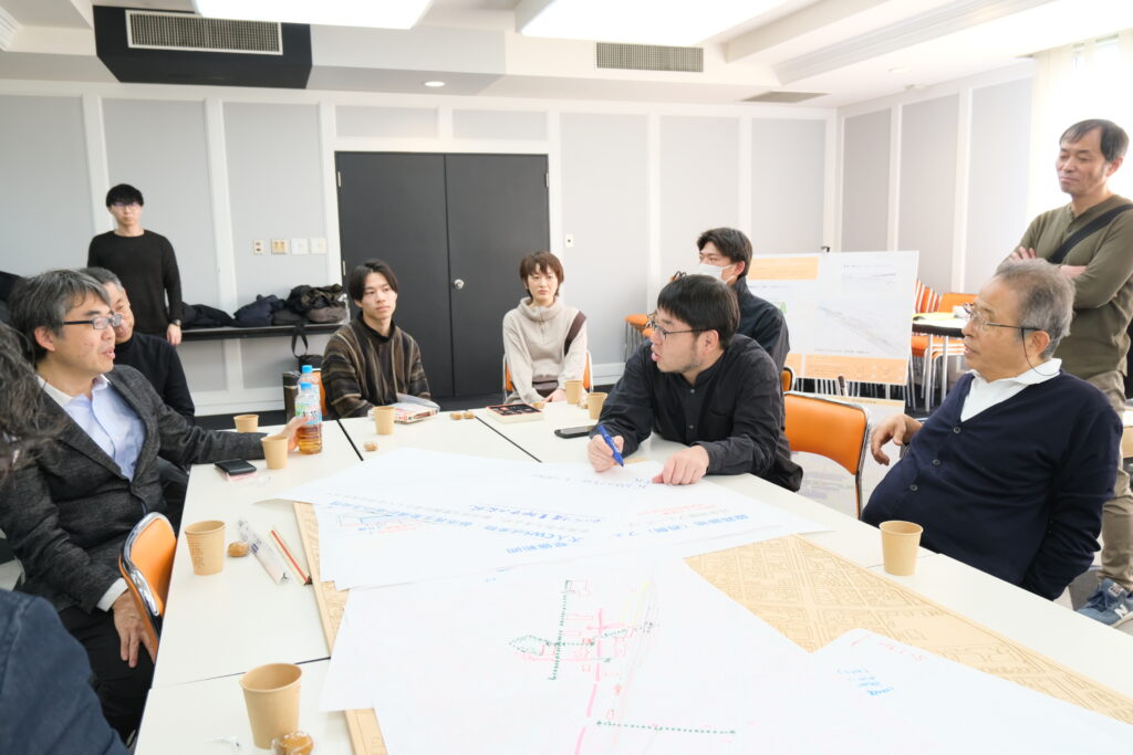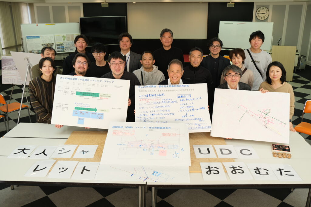 ワークショップには、3名の先生方のほか、UDCおおむたスタッフ、フェロー、学生シャレットワークショップに参加した学生、大牟田市職員に加え、当日お立ち寄りいただいた市民の皆様も交えて実施されました。
