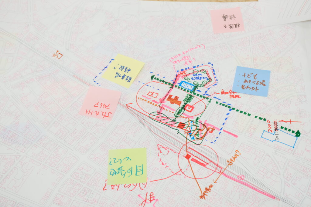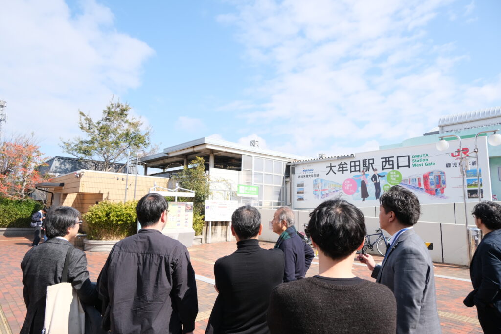 一度休憩を挟み、実際に大牟田駅周辺から笹林公園周辺までを歩いて視察しました。机上での検討内容を実際のスケール感に照らし合わせ、現場の空気感を確認したうえで会場に戻り、検討内容をさらに精査・ブラッシュアップしていきました。