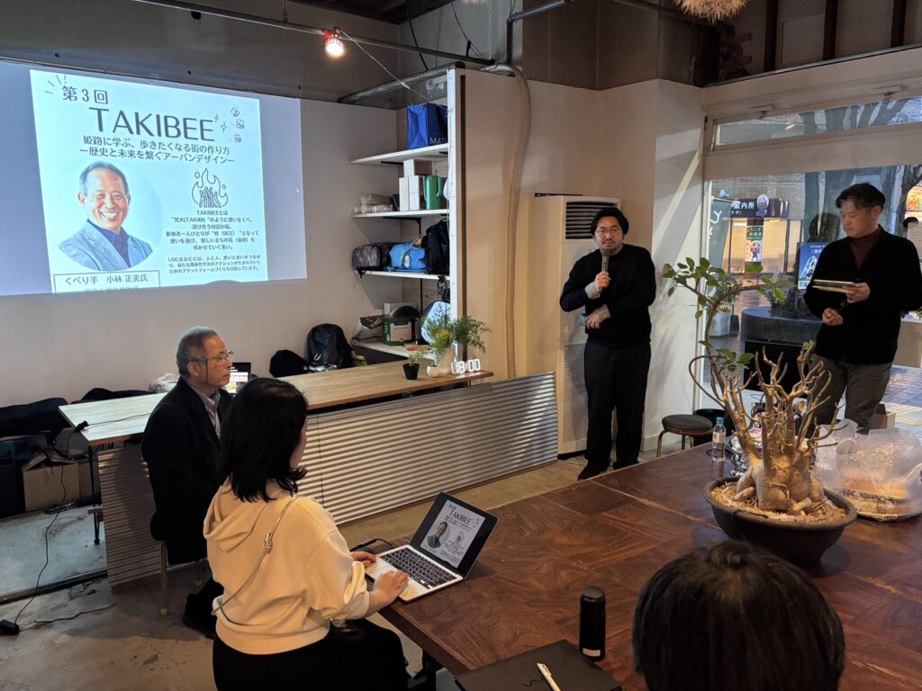 2026年2月14日(金)18:00よりカタルバオセロ(大牟田駅東口)にて UDCOMT.は、明治大学名誉教授の小林正美氏をお迎えし 『第3回TAKIBEE 姫路に学ぶ、歩きたくなる街の作り方 〜歴史と未来を繋ぐアーバンデザイン〜』を開催しました。事務局を含め、約20名が参加しました。